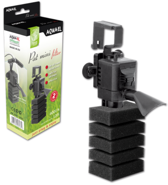 Miniaturowy filtr turbinowy PAT MINI przeznaczony do małych akwariów słodkowodnych. Urządzenie to składa się z maleńkiej głowicy oraz starannie selekcjonowanej gąbki filtracyjnej. Dzięki zastosowaniu innowacyjnych rozwiązań konstrukcyjnych głowica posiada wydajność maksymalną aż 400 l/h, czyli tyle, ile typowy średniej wielkości turbinowy filtr akwariowy. A wszystko to przy poborze energii nie większym niż 4 W.
