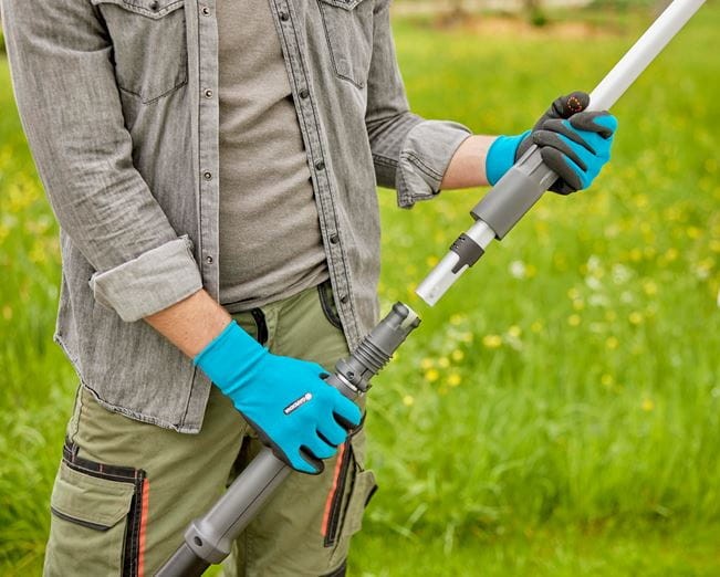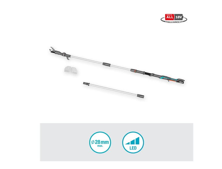HighCut można wygodnie transportować i przechowywać dzięki dwuczęściowemu wałowi. Akumulator POWER FOR ALL sprawia, że cięcie jest proste, bez dużego zapotrzebowania na energię. Oryginalne ostrza GARDENA, produkowane w Niemczech z hartowanej stali, zapewniają czyste, płynne cięcie świeżych gałęzi o średnicy do 28 mm. Są pokryte nieprzywierającą powłoką i precyzyjnie szlifowane, dzięki czemu cięte gałęzie nie przyklejają się do ostrza. Smukła, obrotowa głowica tnąca pozawala na cięcie gałęzi pod kątem 60 stopni. Ponadto głowica ustawiona pod kątem zapewnia dobre pole widzenia. W przypadku, gdy gałąź zostanie na drzewie, można ją ściągnąć za pomocą haka umieszczonego na końcu trzonka. Wskaźnik LED na ergonomicznym trzonku pokazuje stan naładowania akumulatora. Naładowany do pełna akumulator wystarcza nawet na 400 cięć. Akumulatory z tej serii mogą być używane w wielu różnych urządzeniach do domu i ogrodu.