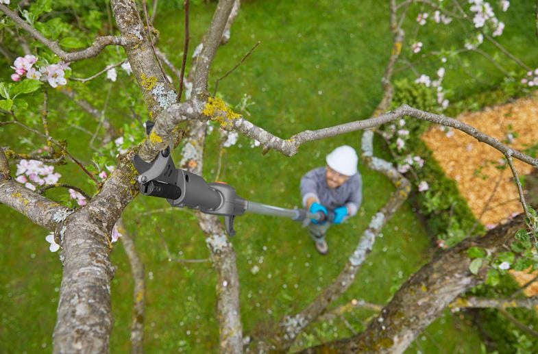 Akumulatorowe teleskopowe nożyce do gałęzi HighCut 360/18V P4A pozwalają w prosty sposób ciąć gałęzie na dużej wysokości prosto z ziemi.