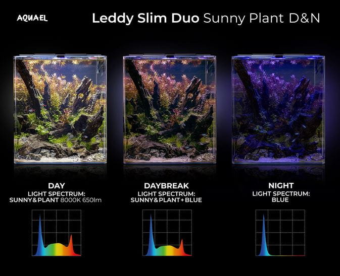 - Kompleksowe oświetlenie Leddy Slim Duo Sunny&Plant D&N, które doskonale odwzorowuje barwy wnętrza zbiornika dzięki spektrum Sunny i wspomaga szybki, niezakłócony wzrost roślin dzięki spektrum Plant. Dodatkowo lampa posiada 3 tryby świecenia: DAY/DAYBREAK/NIGHT;