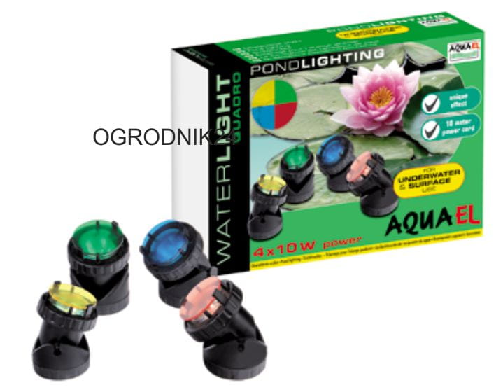 WATERLIGHT QUADRO to zestaw czterech lamp podwodnych o mocy 10W każda. Dzięki wymiennym filtrom świetlnym umożliwiają stworzenie wielobarwnej iluminacji w ogrodzie i oczku wodnym. Pracują w bezpiecznej technologii 12V. Ich instalację ułatwia długi, 10-metrowy przewód zasilający.
