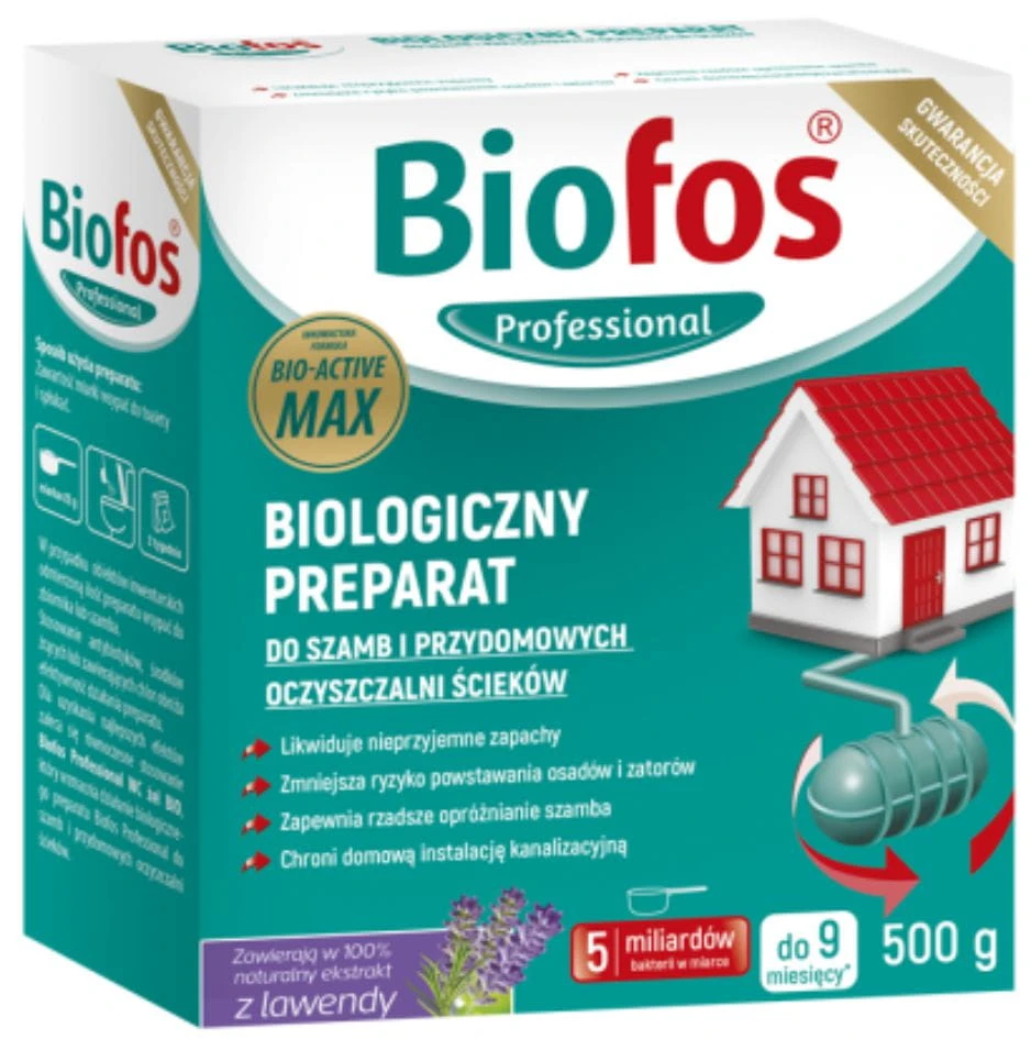 Biofos Professional biologiczny preparat do szamb i przydomowych oczyszczalni ścieków posiada innowacyjną formułę Bio-Active Max ze składnikiem aktywnym biologicznie (probiotykiem), który działa kompleksowo wewnątrz domowego systemu instalacji sanitarnej, przyspieszając procesy rozkładu i upłynniania ścieków.