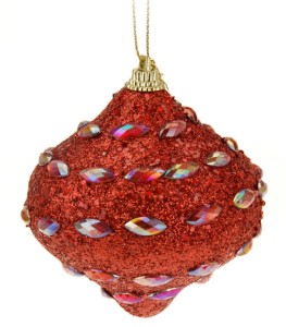 Bombka ozdobiona brokatem, cekinami i kamieniami w kolorze czerwonym.