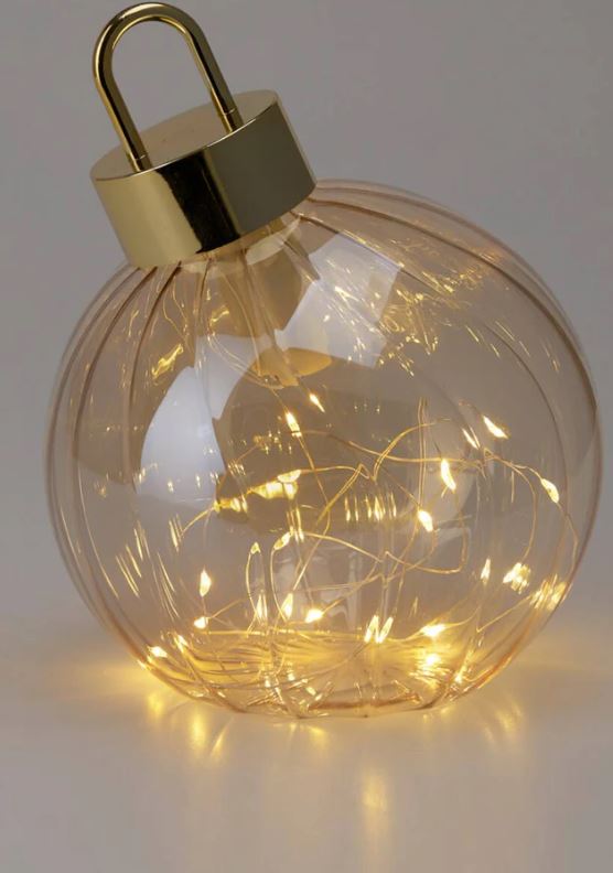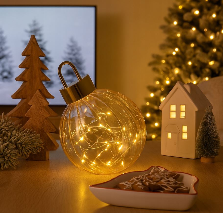 Elegancka bombka dekoracyjna LED to wyjątkowa ozdoba, która wprowadzi do wnętrza przytulny i świąteczny klimat. Wykonana z przezroczystego szkła, wypełniona 15 drobnymi diodami LED o ciepłym świetle, tworzy nastrojową iluminację. Idealna zarówno jako samodzielna dekoracja, jak i element większej aranżacji bożonarodzeniowej.