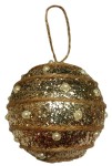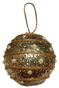 Bombka została wykonana z tworzywa sztucznego, jest zdobiona złotym brokatem i perełkami. Posiada sznurek do zawieszenia na choince bądź służyć jako ozdoba wnętrza w czasie świąt.