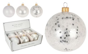 Bombki białe szklane 8cm zdobione srebrnym brokatem 12szt 006149
