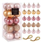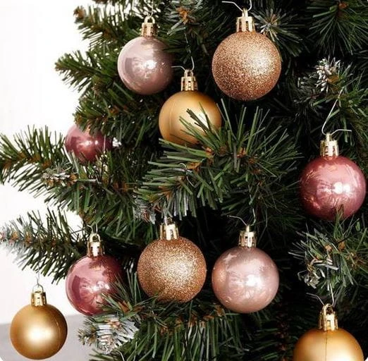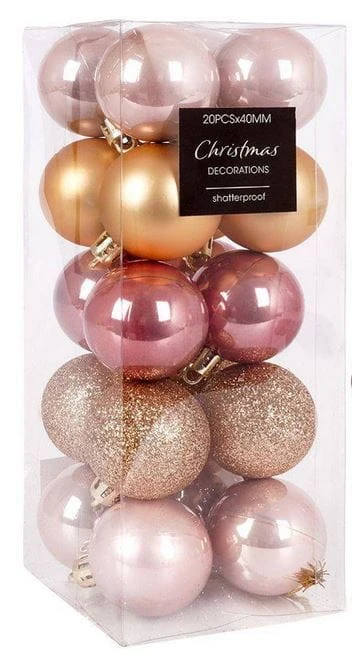 W zestawie bombki w kolorze różowym i złotym w wersji błyszczącej, brokatowej oraz matowej.