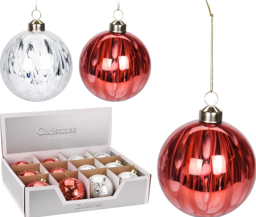 Bombki szklane czerwone srebrne 8cm 12 szt 705281