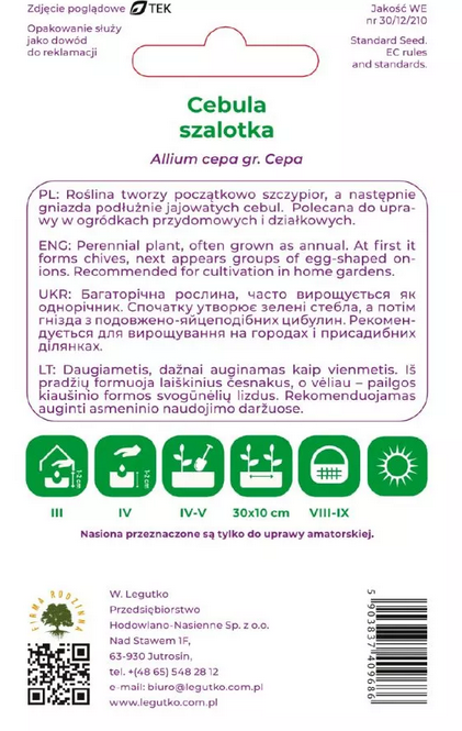 Nasiona wysiewać wczesna wiosną w rzędy co 30 cm. Jesienią otrzymamy pojedyncze cebulki, z których większe przeznacza się do spożycia, a mniejsze stanowią doskonały materiał rozmnożeniowy na następny rok. Szalotka ma niewielkie wymagania klimatyczne. Wymaga gleb średnio zwięzłych, przepuszczalnych, zasobnych w próchnicę.