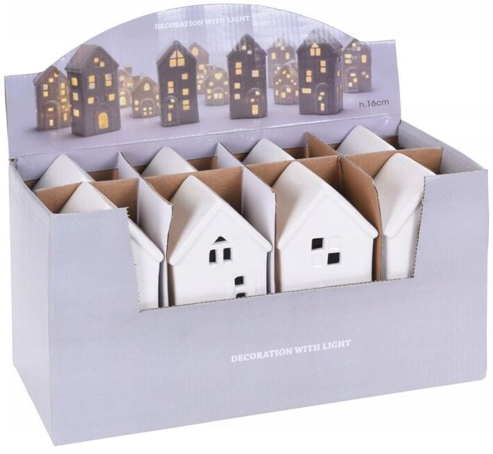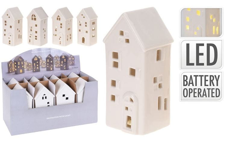 Dekoracja LED z porcelany w kształcie domku w kolorze białym.