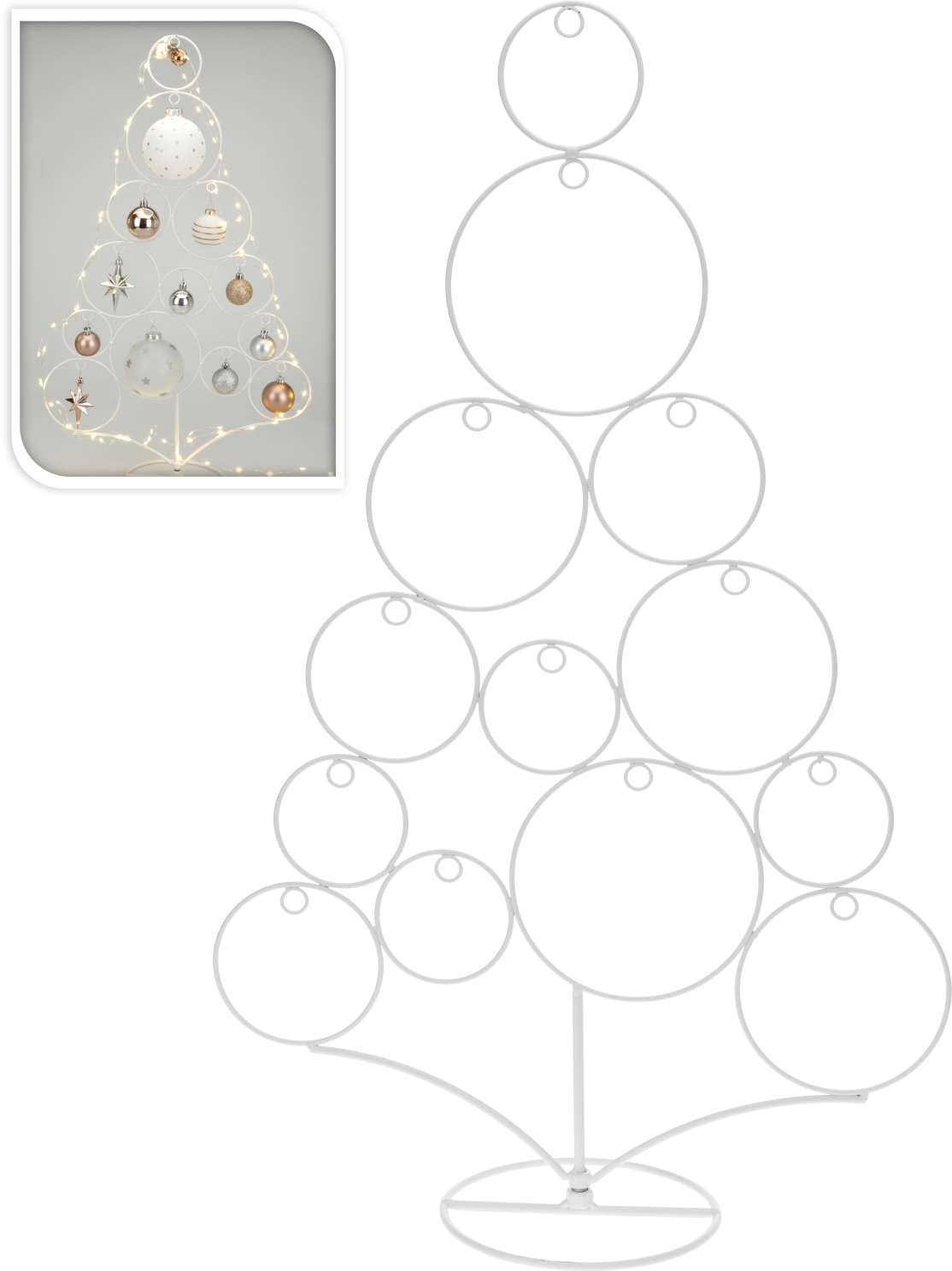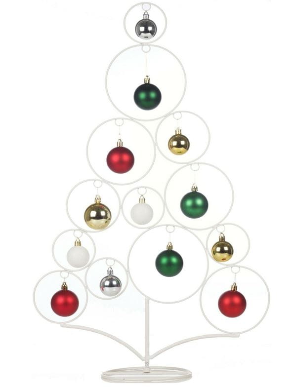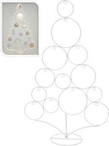 Metalowa choinka z kółeczkami do zawieszenia ozdób lub bombek.