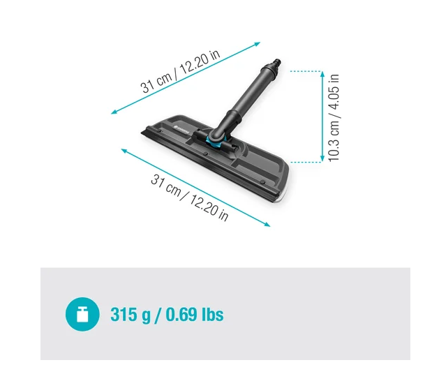 Myjka do czyszczenia ma szerokość 31 cm i można ją obracać o 360°. Dzięki temu jest łatwa w obsłudze i wystarczająco elastyczna, żeby dotrzeć do trudno dostępnych miejsc. Przegub obrotowy można również zablokować, żeby wygodnie korzystać ze ściągaczki.