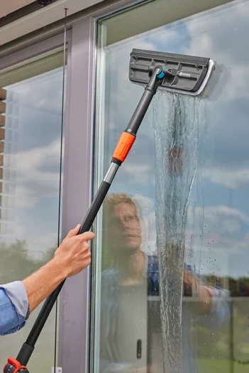 Okna zewnętrzne są wyjątkow narażone na wiele zabrudzeń spowodowanych warunkami pogodowymi lub sąsiedztwem dróg. Myjka do okien ze ściągaczką została specjalnie opracowana, żeby szybko i wygodnie przywrócić szybom ich dawny blask. Dzięki złączu GARDENA Original System, myjkę do okien można podłączyć bezpośrednio do węża ogrodowego i używać do mycia mniejszych okien lub w połączeniu z trzonkiem Cleansystem do mycia większych powierzchni.