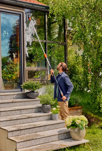 Miękkie włosie szczotki zostało opracowane specjalnie z myślą o wszystkich delikatnych powierzchniach zewnętrznych. Czyszczenie szklanych lub plastikowych powierzchni, np. pergoli, jest zatem delikatne, ostrożne i nie pozostawia zarysowań. Szczotka miękka przewodząca wodę sprawia, że usuwanie kurzu, brudu i osadów z delikatnych powierzchni jest łatwe i nie wymaga wysiłku.