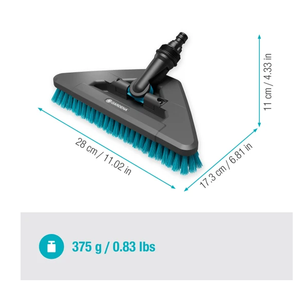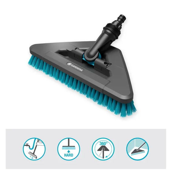 Twarde włosie trójkątnej szczotki zostało opracowane specjalnie z myślą o wszystkich mniej delikatnych powierzchniach zewnętrznych. Idealnie nadaje się do dokładnego czyszczenia dużych, wytrzymałych powierzchni – czy to podłóg tarasów, kamiennych schodów czy patio. Dzięki twardej szczotce przewodzącej wodę gruby i uporczywy brud można usunąć w mgnieniu oka.