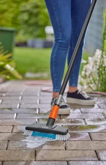Aby dokładnie wyczyścić powierzchnię w mgnieniu oka, wystarczy połączyć twardą szczotkę Cleansystem z trzonkiem a następnie całość podłączyć do węża ogrodowego. Szczotka doskanale radzi sobie z szybkim i łatwym czyszczeniem tarasów, podwórek i podjazdów. Jest niezwykle łatwa w użyciu i nadaje się do wielu prac porządkowych na dużych powierzchniach wokół domu, a efekty pracy są zawsze imponujące.