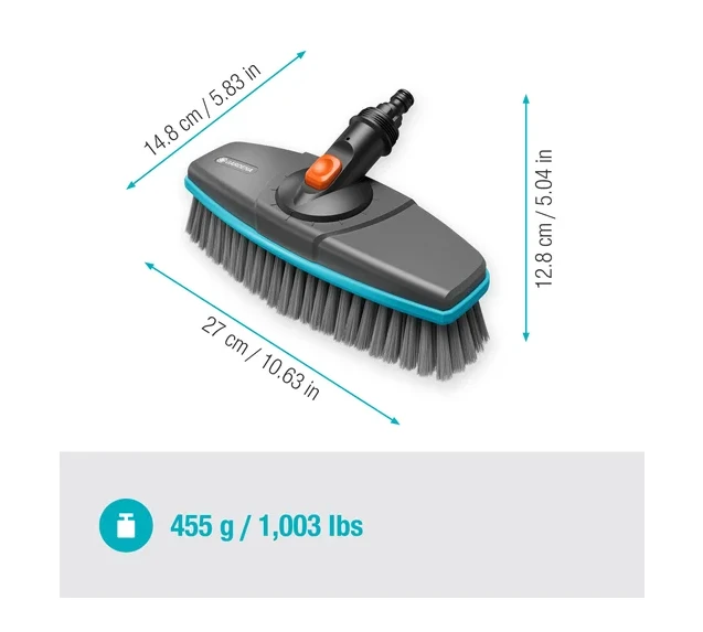 - Przewodzi wodę: Podłączona do węża z wodą za pomocą trzonka, szczotka miękka delikatnie czyści duże powierzchnie