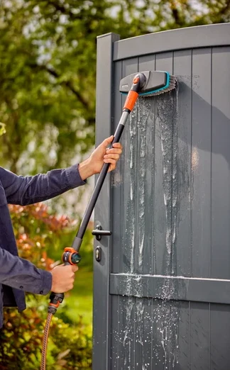 Szczotka z trzonkiem GARDENA Cleansystem zachwyca delikatnym czyszczeniem na mokro większych powierzchni zewnętrznych np. szklarni.
