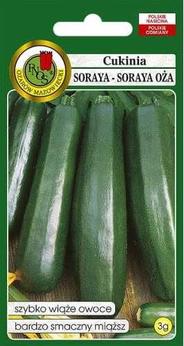Soraya to nasiona cukini z firmy Pnos. Odmiana krzaczasta, słabo rozkrzewiona o ciemnozielonych pędach i liściach. Owoce kształtne, długości do 50 cm, ciemnozielone. Miąższ biały, soczysty, kruchy i bardzo smaczny.Młode owoce są bogate w witaminę C. Polecana do bezpośredniego spożycia, konserwowania i kiszenia. Uprawa na glebach żyznych, próchniczych z wysiewu wprost do gruntu lub z rozsady. Ma duże zapotrzebowanie na wodę.