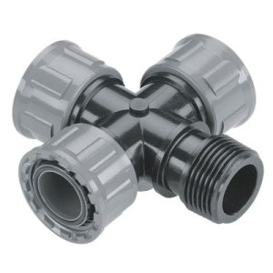 GARDENA czwórnik do zaworu do oszczędzającego miejsce podłączenia zaworów w studzience. Prosty montaż dzięki gwintowym połączeniom. Gwint wewnętrzny 3 x 1" i gwint zewnętrzny 1 x 1".