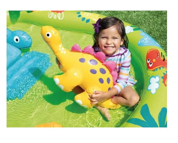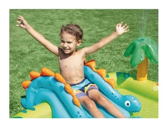 Wodny plac zabaw Mały Dino od firmy Intex to zabawa na świeżym powietrzu wśród palm , wulkanów i dinozaurów