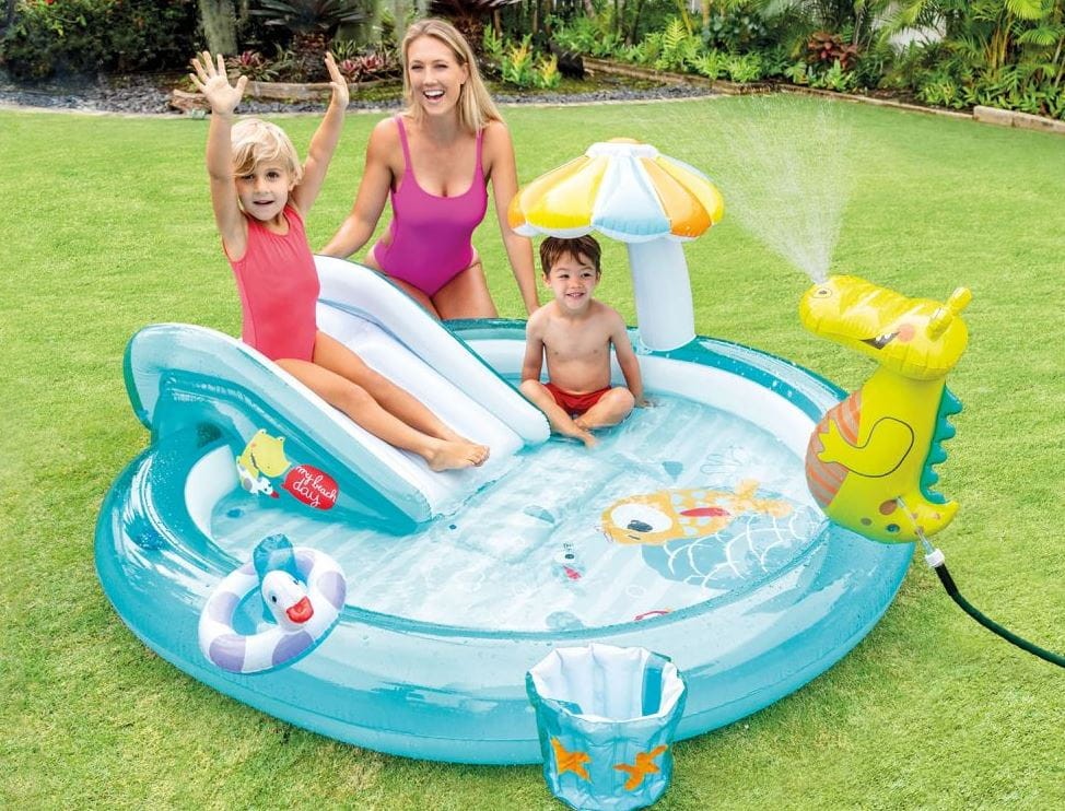 Dmuchany, wodny plac zabaw ALIGATOR od INTEX to zabawa dzięki której Twoje dzieci aktywnie spędzą wakacje na świeżym powietrzu. Rozmiary placu zabaw 201x170x84 cm - to wystarczająca wielkość, by zaprosić na słoneczne swawole, dzieci sąsiadów. Plac zabaw posiada brodzik, zjeżdżalnię oraz dmuchane elementy jak np. aligator, wiadro na ryby, grzybek - daszek oraz kaczuszka. Przy takiej ilości wariantów rozrywki wodnej, niestraszne już są maluchom długookresowe upały.