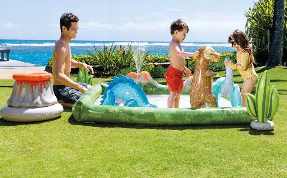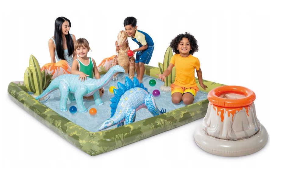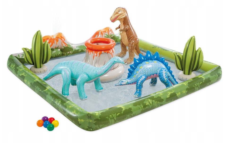 Wyposażony w fontannę, piłeczki do rzucania dmuchane dinozaury.