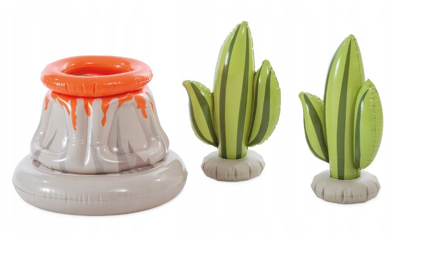 Dmuchany basen z trzema dmuchanymi dinozaurami, wulkanem i kaktusami będzie z pewnością nie lada atrakcją, zapewniając dzieciom bezpieczną zabawę.