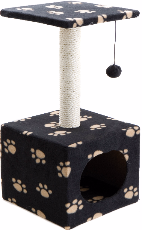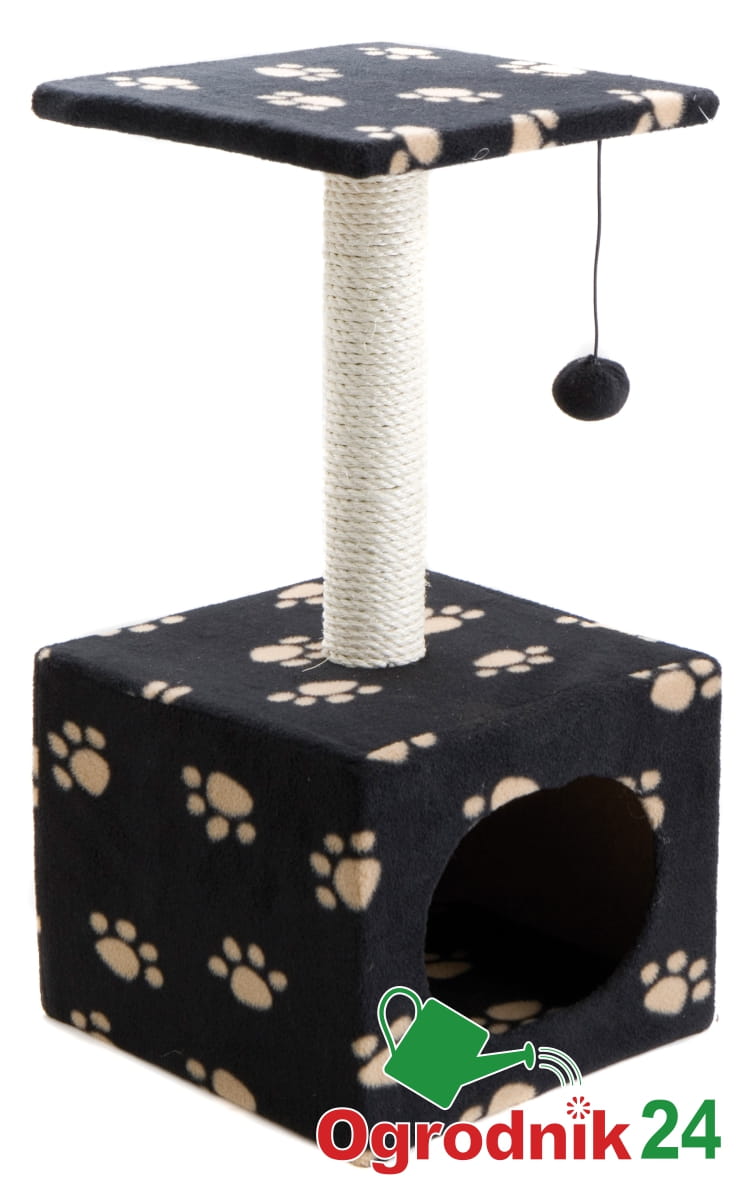 Komfortowy wielofunkcyjny drapak dla kota wyposażony w budkę z miękkiego, przyjemnego dla kota materiału w kocie łapki, otworem wejściowym i piłką oraz dodatkowe legowisko w formie półki.