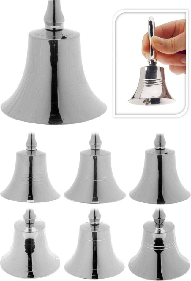Ręczny dzwonek Mikołaja wykonany z metalu w kolorze srebrnym.