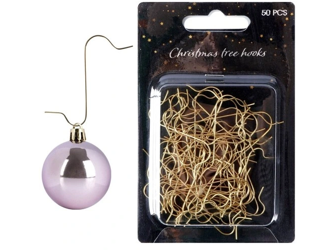Zestaw 50 haczyków do zawieszenia bombek oraz ozdób świątecznych. Dzięki nim proces dekorowania choinki staje się łatwiejszy i bardziej przyjemny, a ozdoby zostają odpowiednio zabezpieczone. Haczyki są wygodne w użytkowaniu, wystarczy przyczepić haczyk do gałęzi choinki, a następnie zawiesić na nim ozdobę. Haczyki pomagają chronić delikatne ozdoby choinkowe przed uszkodzeniami. Dzięki nim ozdoby nie dotykają gałęzi ani innych ozdób, co zmniejsza ryzyko rozbicia się lub uszkodzenia. Wyprodukowano zgodnie z europejskimi standardami.