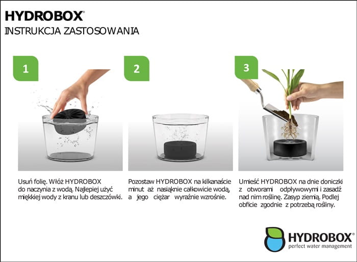 Hydrobox® pochłania wodę rozproszoną w glebie i magazynuje ją w pobliżu korzeni. W ten sposób umożliwia roślinom samodzielny i optymalny pobór wody do systemu korzeniowego, w dawce i czasie najlepszym do ich prawidłowego rozwoju.