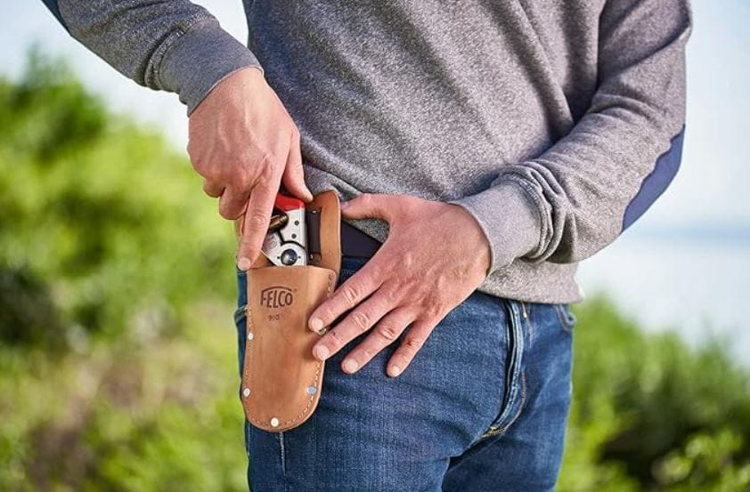Dobrze jest mieć poczucie, że narzędzia FELCO są niezwykle solidne i wytrzymałe, przystosowane do ciężkich zadań i w razie potrzeby możesz przywrócić im skuteczność, wymieniając najważniejsze części. Mimo to lepiej unikać upuszczania ich, zgubienia i wystawienia na oddziaływanie warunków atmosferycznych. Kabura z naturalnej skóry zapewnia bezpieczeństwo sekatora do przycinania i ogranicza prawdopodobieństwo wystąpienia niepożądanych uszkodzeń. Wystarczy, że przymocujesz kaburę FELCO 910 do paska (wykorzystując szlufkę lub klips)