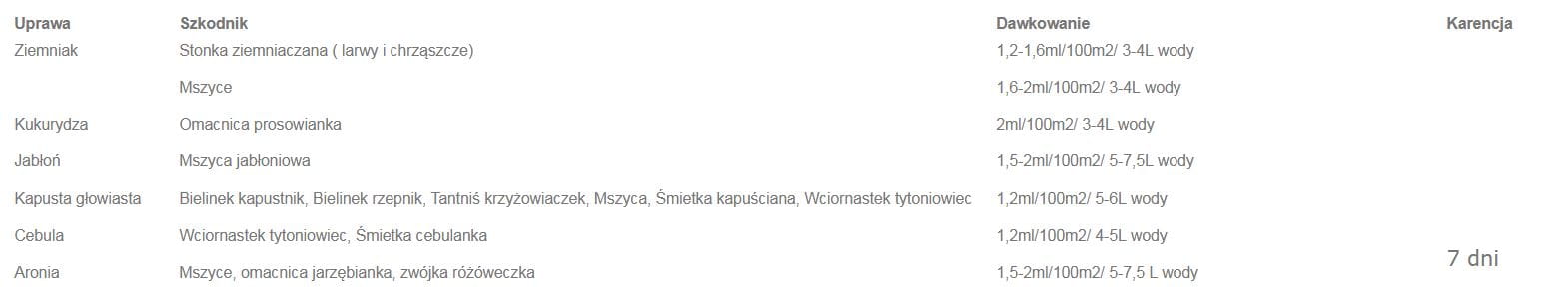 Środek owadobójczy w formie zawiesiny kapsuł w cieczy do rozcieńczania wodą, o działaniu kontaktowym i żołądkowym, przeznaczonym do zwalczania szkodników gryzących i ssących w roślinach rolniczych, sadowniczych i warzywnych.