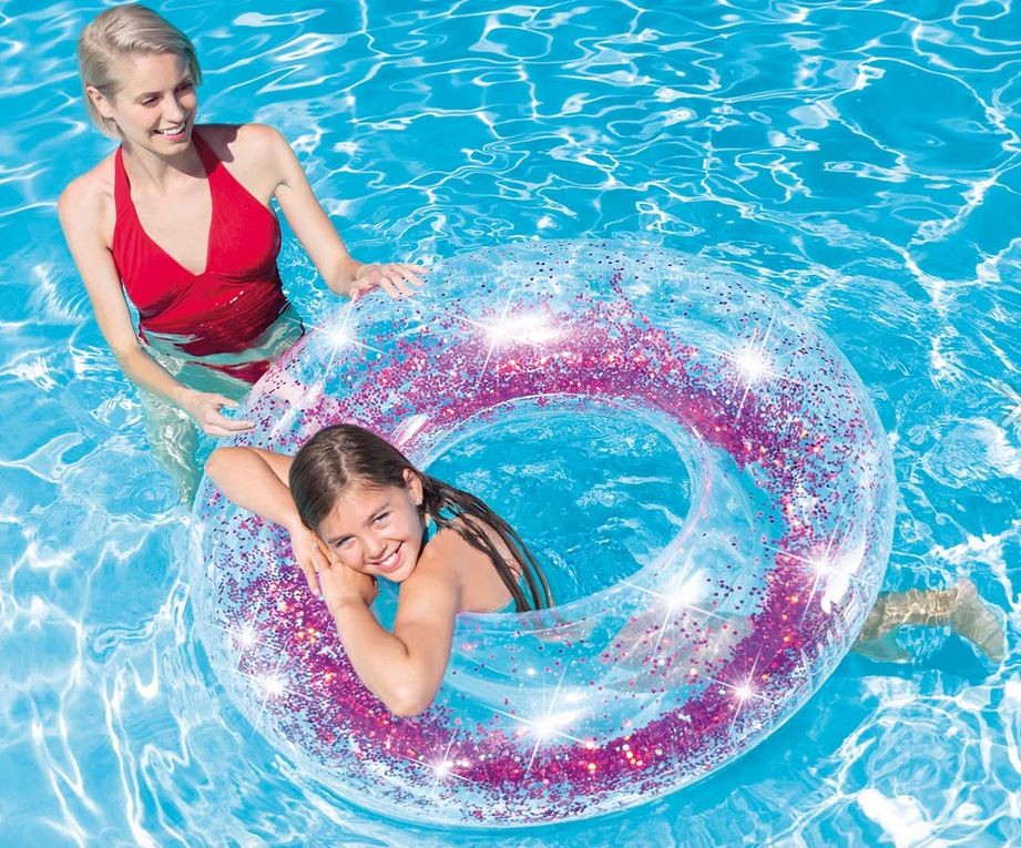 Pełne blasku wypełnione milionami błyszczących drobinek koło do pływania w letnim słońcu przyciągną wzrok rozbłyskując na tafli wody