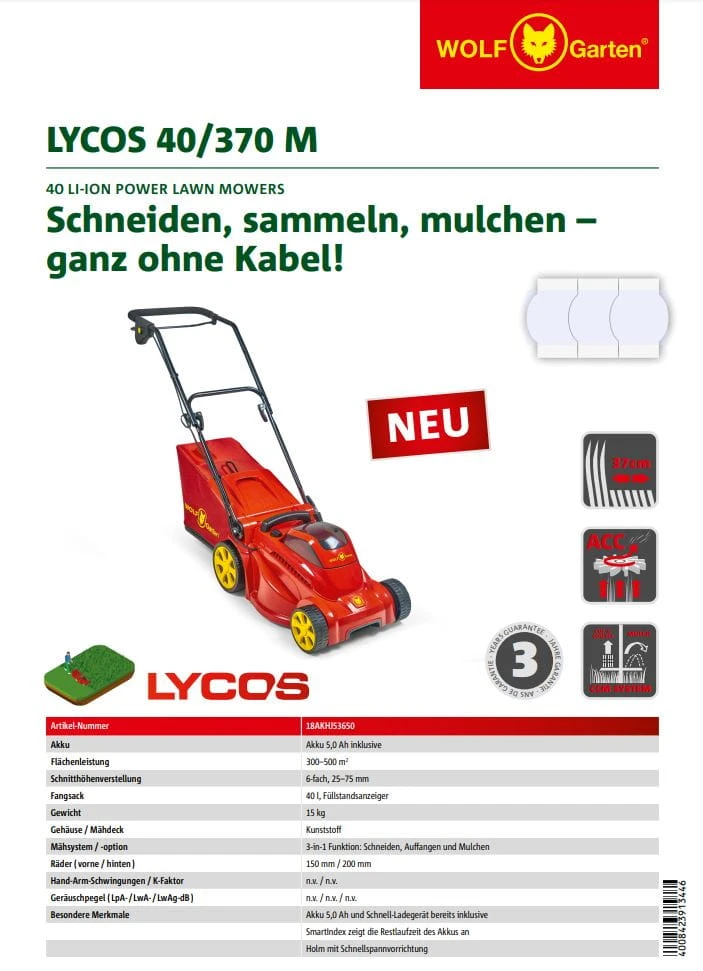Dane kosiarki WOLF-Garten LYCOS 40/370 M: