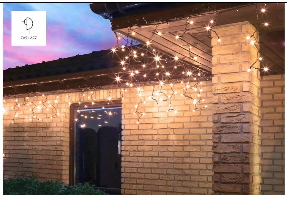 Dekoracja świetlna 100 LED do stosowania wewnątrz i na zewnątrz pomieszczeń. Efektowna dekoracja dachów, balustrad i balkonów, wyposażona w zasilacz i 5-metrowy przewód zasilający, umożliwiający wygodny montaż. Dodatkowe gniazdo końcowe pozwala na łączenie ze sobą kompletów tego samego typu - dopuszczalna ilość połączonych kompletów, zasilanych z jednego źródła wynosi 3 sztuki.