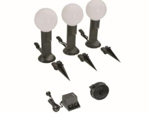 Obejmuje trzy lampy kuliste 10 W (art. nr 4202), jeden transformator ST 60/2 (art. nr 4274), 15 metrowy kabel instalacyjny (art. nr 4302) oraz trzy szpilki (art. nr 4317-20).
