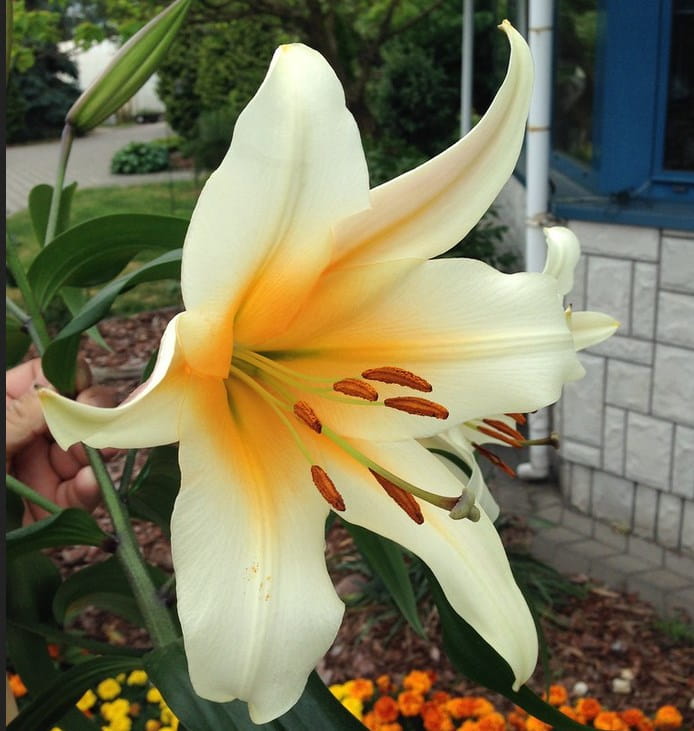 Już same liście lilii wyglądają niezmiernie dekoracyjnie, jednak najbardziej efektownie wygląda w okresie kwitnienia, czyli od czerwca do lipca. Pojawiają się wtedy na długich pędach kwiatowych biało-żółte, duże kwiaty, których średnica wynosi około 25 cm. Charakteryzują się one bardzo mocnym, intensywnym zapachem.