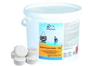 1 tabletka 20 g na 2 m3 wody co ok. 7 dni. Przy małych basenach stosować część tabletki