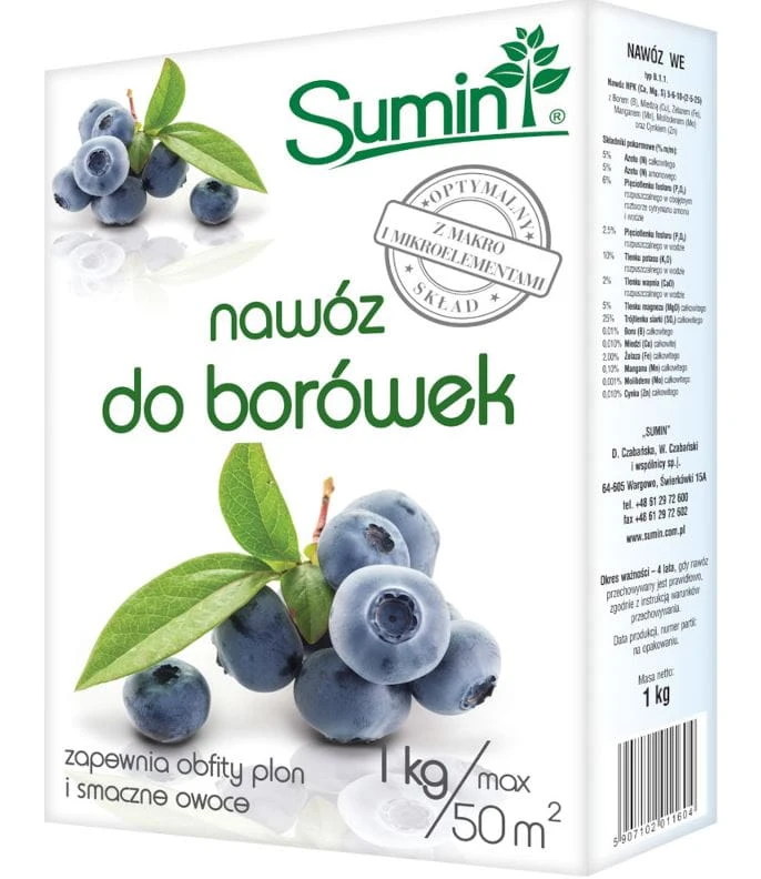 Po posadzeniu borówek i dobrym ich zakorzenieniu, nawóz SUMIN do borówek należy rozsiewać w ilości 20-50 g nawozu (maksymalna roczna dawka) na 1m2 gleby wokół rośliny, w kilku dawkach podzielonych, co miesiąc – dwa, aż do końca sierpnia (np. dolna zalecana ilość 20 g w 3 dawkach: 5 g w marcu – kwietniu, 10 g w maju – czerwcu, 5 g w lipcu – sierpniu).
