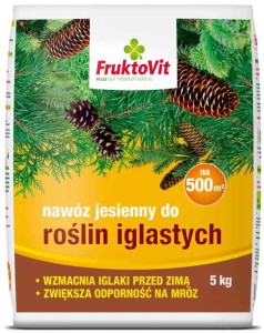 FruktoVit PLUS nawóz jesienny do iglaków zawiera składniki mineralne, które zaspokajają zapotrzebowanie pokarmowe roślin iglastych jesienią oraz zapewniają im lepszy start już od wczesnej wiosny. Stosowanie nawożenia jesiennego poprawia wybarwienie igieł, wspomaga drewnienie pędów, chroni iglaki przed przemarzaniem oraz korzystnie wpływa na ich gospodarkę wodną. Nawóz zawiera składniki pokarmowe w ilościach i formach szczególnie dostosowanych do wymagań pokarmowych roślin iglastych, takich jak: cis, cyprys, daglezja, jałowiec, jodła, modrzew, sosna, świerk, żywotnik i inne.
