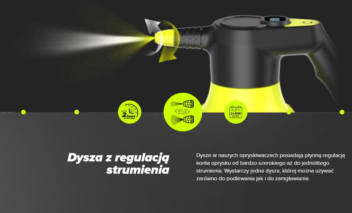 Dysze w naszych opryskiwaczach posiadają płynną regulację konta oprysku od bardzo szerokiego aż do jednolitego strumienia. Wystarczy jedna dysza, której można używać zarówno do podlewania jak i do zamgławiania.