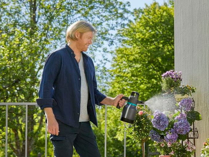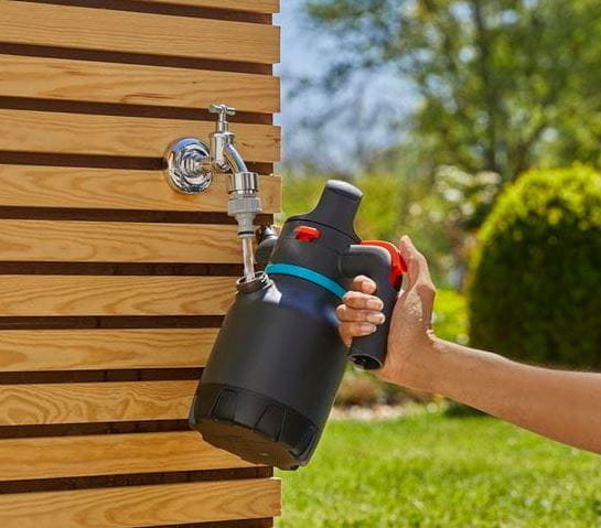 Przed rozpoczęciem oprysku, należy w pojemniku wytworzyć ciśnienie, posługując się ergonomicznym uchwytem D-kształtnym z ogranicznikiem. Następnie wystarczy przyciskać przycisk na uchwycie. Wbudowana funkcja 360° zapewnia zasysanie wody podczas opryskiwania, bez względu na ustawienie opryskiwacza. Wysokiej jakości mosiężna dysza na wylocie głowicy opryskiwacza może nie tylko być regulowana (mgiełka lub strumień punktowy), ale także ustawiona pod kątem do 90°. Dzięki temu możliwe jest opryskiwanie liści od spodu bez konieczności skręcania nadgarstka i ustawiania dłoni pod niewygodnym kątem.