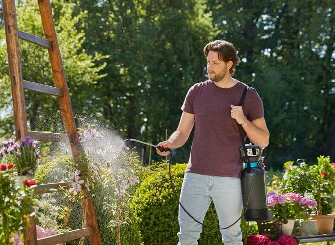 Przed uruchomieniem, należy w pojemniku o pojemności 5 litrów wytworzyć ciśnienie, pompując za pomocą praktycznego D-kształtnego uchwytu. Praktyczne oparcie stóp w dolnej części opryskiwacza zapewnia użytkownikom stabilność podczas pompowania. Aby umożliwić użytkownikom wykorzystanie organicznych nawozów domowej roboty, do opryskiwacza dołączono przepisy i odpowiedni filtr nylonowy.