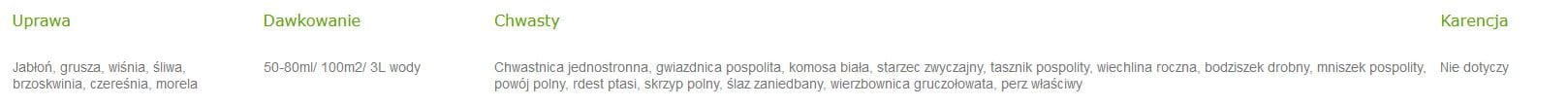 Środek chwastobójczy w formie płynu do sporządzania roztworu wodnego, stosowany nalistnie, przeznaczony do zwalczania rocznych i wieloletnich chwastów jednoliściennych i dwuliściennych w sadach drzew ziarnkowych i pestkowych. Środek przeznaczony jest do stosowania przy użyciu opryskiwaczy polowych, opryskiwaczy sadowniczych wyposażonych w belkę herbicydową oraz opryskiwaczy ręcznych.