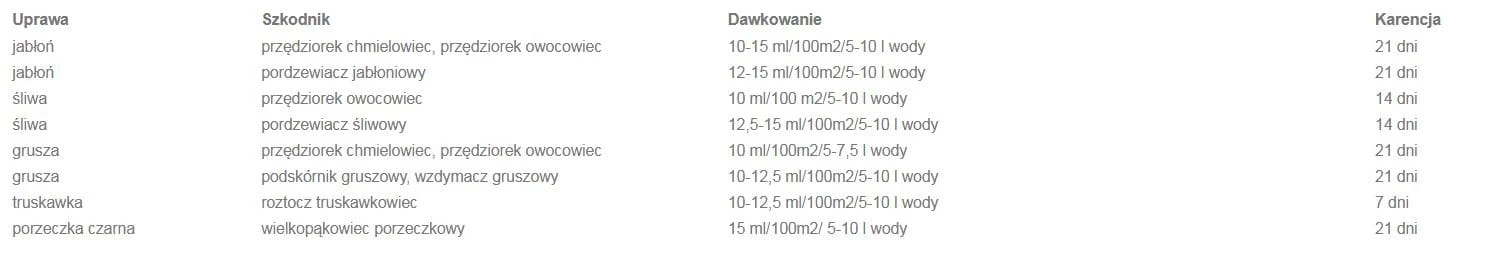 Środek przędziorkobójczy w formie koncentratu w postaci stężonej zawiesiny do rozcieńczania wodą, o działaniu kontaktowym i żołądkowym, przeznaczony do zwalczania przędziorków i szpecieli w uprawach jabłoni, gruszy, śliwy, agrestu, maliny, porzeczki białej, porzeczki czerwonej, porzeczki czarnej, truskawki, winorośli, uprawianych pod osłonami: cukinii, oberżyny, papryki, pomidora, ogórka, uprawianych w gruncie i pod osłonami roślin ozdobnych oraz w szkółkach leśnych drzew liściastych i iglastych.