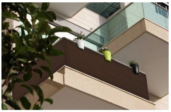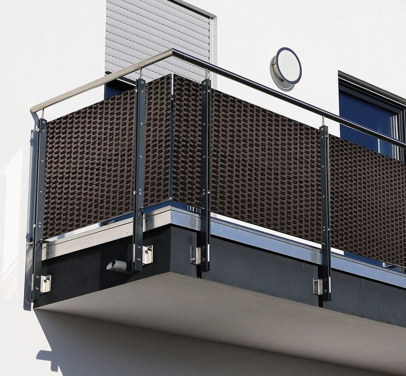 Osłona-mata balkonowa z technorattanu w kolorze ciemnobrązowym osłoni od wiatru, deszczu i śniegu.