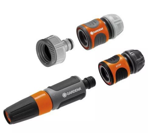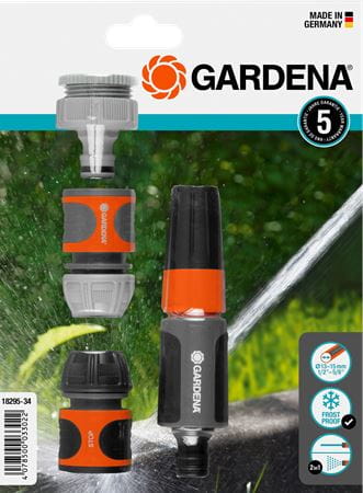 Zestaw podstawowy GARDENA zawiera gwintowane przyłącze kranowe z adapterem (art. nr 18202 i 5305), szybkozłącze (art. nr 18215), szybkozłącze ze stopem (art. nr 18213) i pistolet zraszający (art. nr 18300).