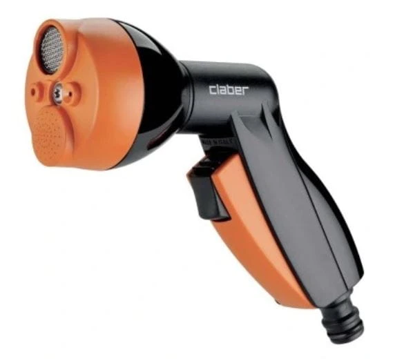 Lekki i kompaktowy pistolet wielofunkcyjny do wody Claber. Ergonomiczny uchwyt. Wyposażony we frontowy przycisk do sterowania przepływu jak i odcięcia wody. Dwa ustawienia siły przepływ.